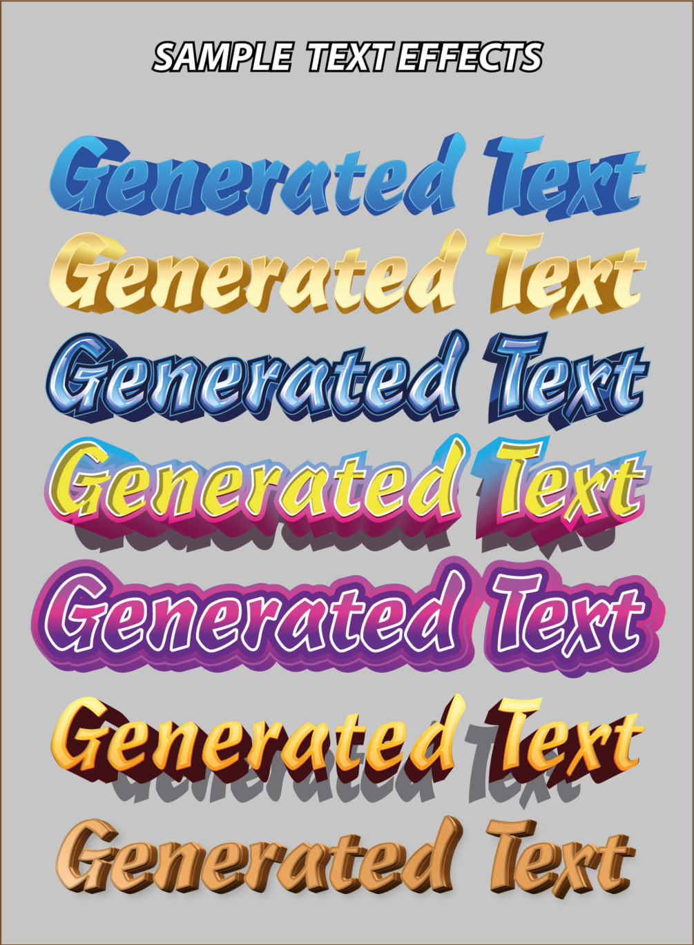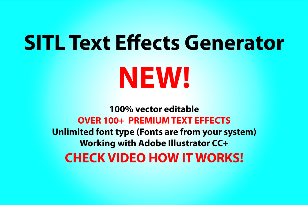 Adobe Illustrator Text Effect Generator is a tool for generating text effects. You need to just select in panel your favourite font, insert the text and click button to generate effect. There you can find over 100 unique text effects, which are editable (after generate you can change font, colors, and text).